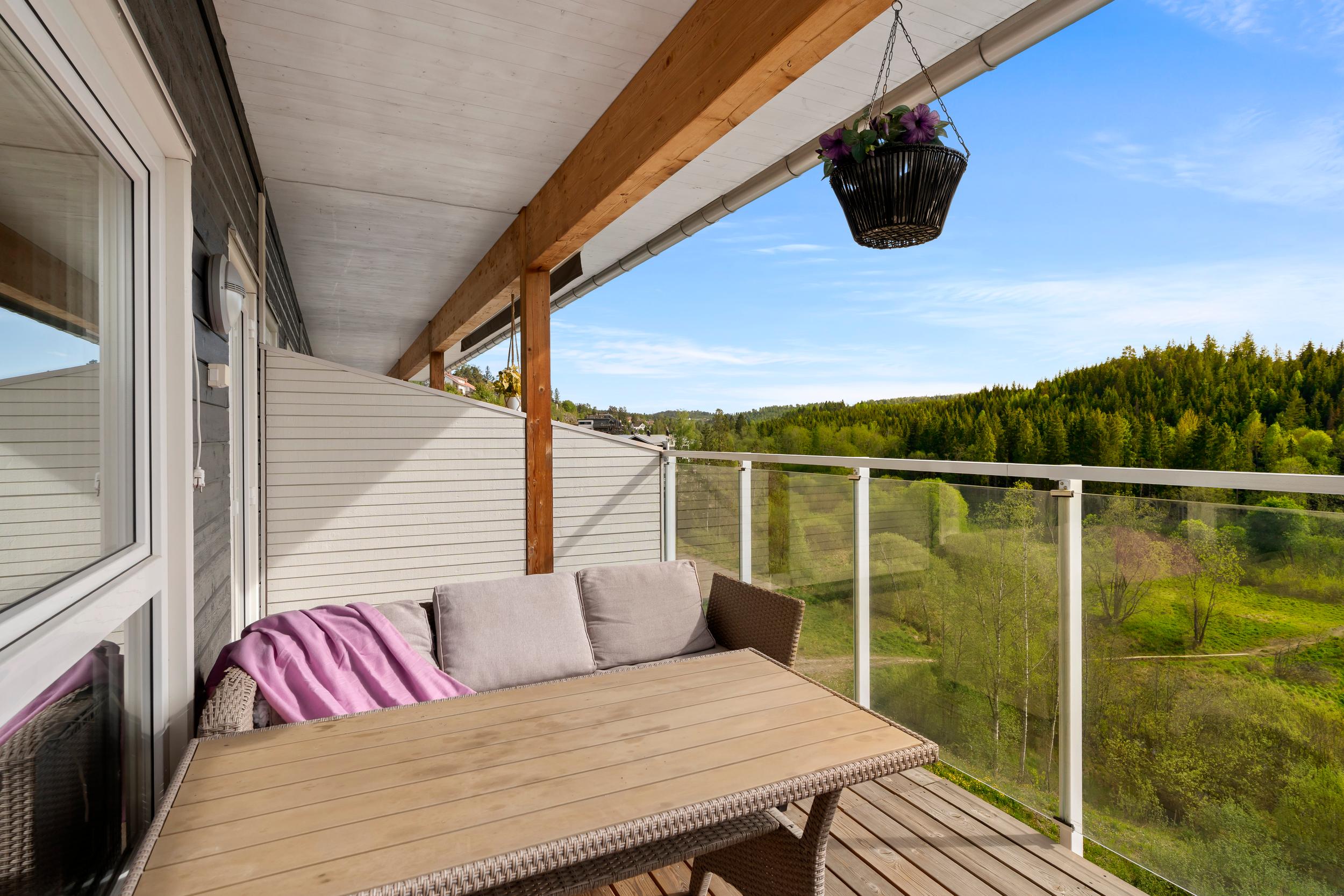 Fra stuen har du utgang til en sydvestvendt, overbygget terrasse på 12 kvm, hvor du kan nyte flotte sol- og utsiktsforhold.