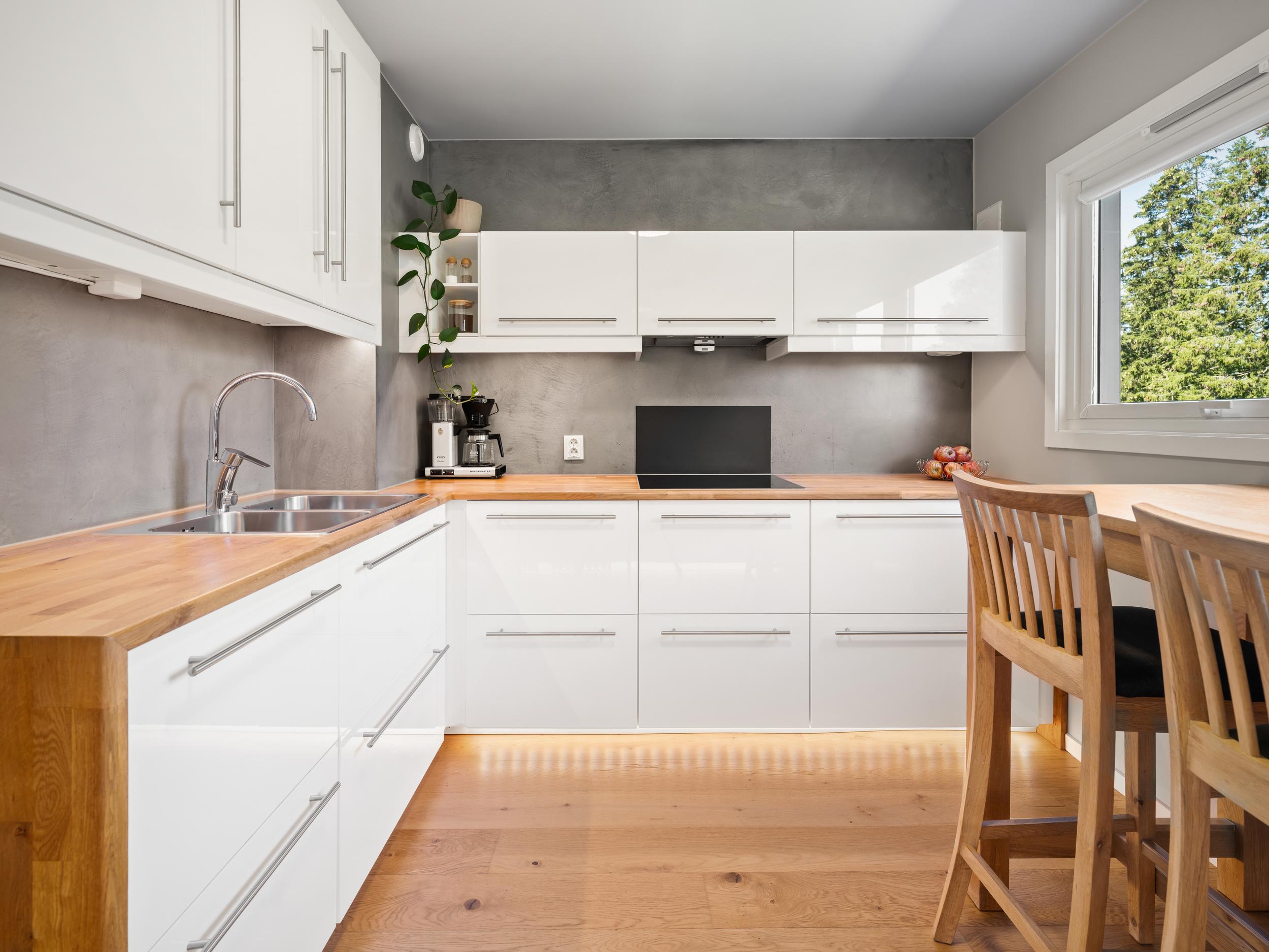 - Moderne kjøkken med stilrene overflater og integrerte hvitevarer, ideelt for både hverdag og fest.