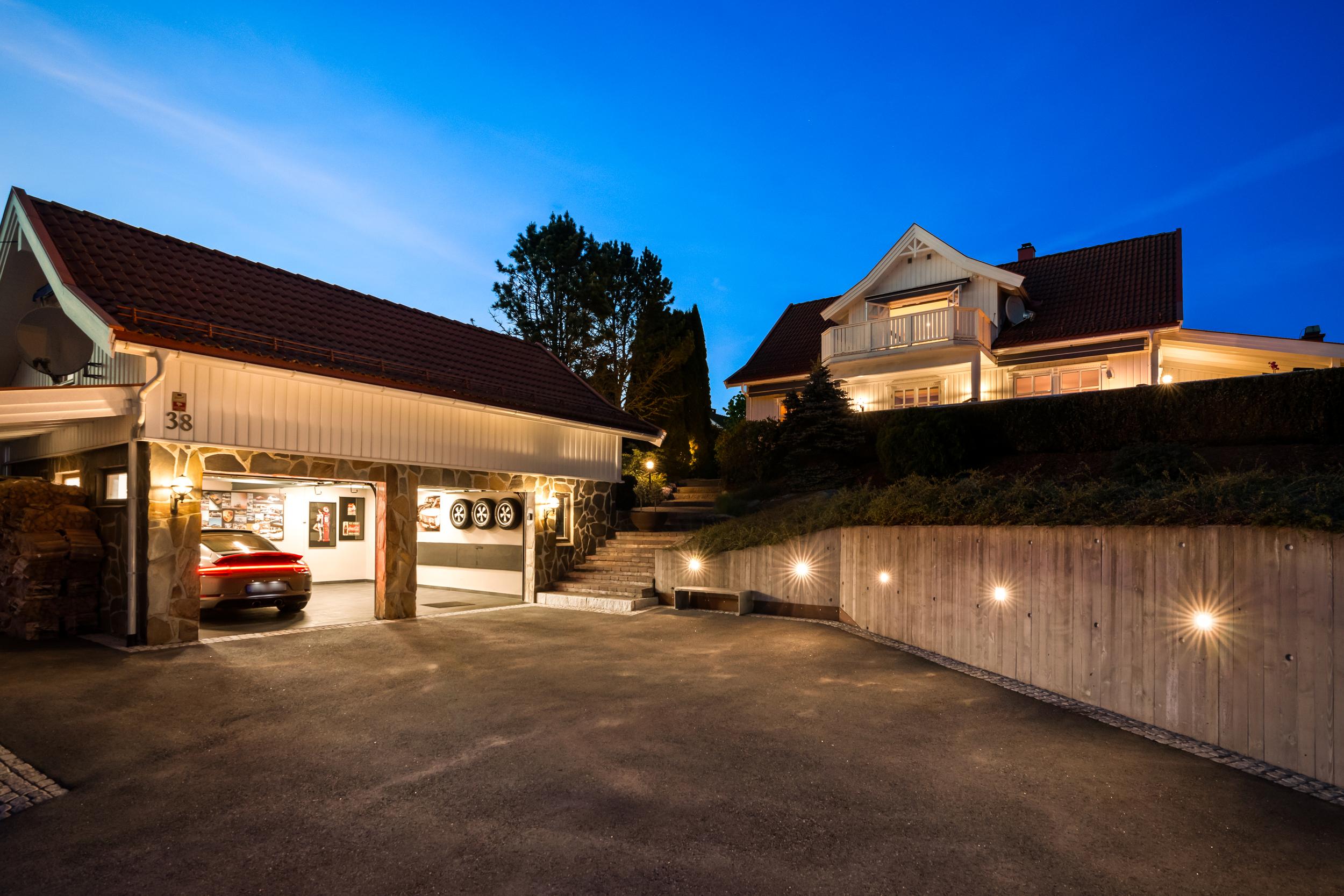 Flislagt dobbelgarasje med bod, samt innredet isolert hems med enkel adkomst.