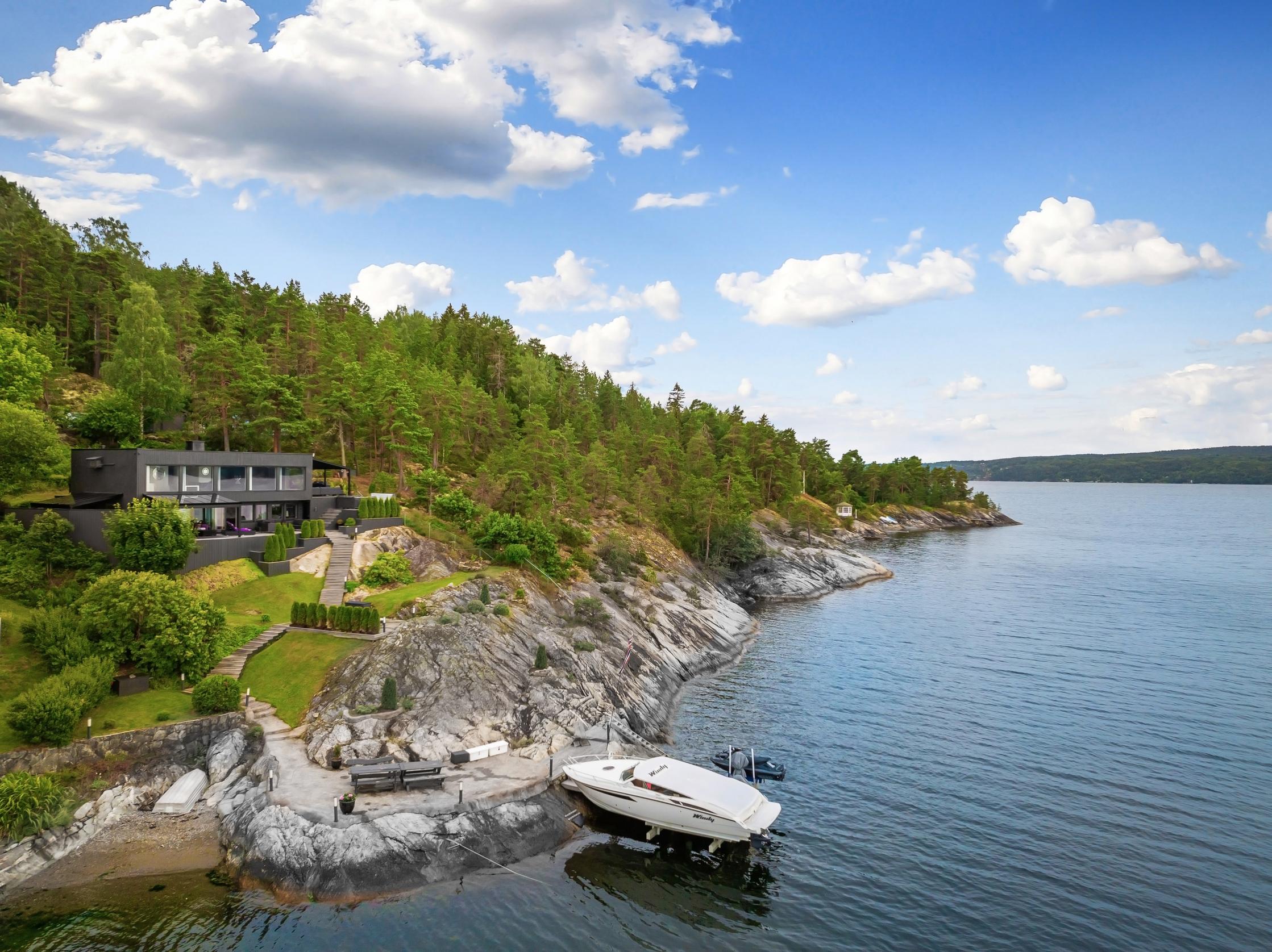 Enebolig med strandlinje, brygge med båtheiser, spektakulær utsikt og svært gode solforhold.